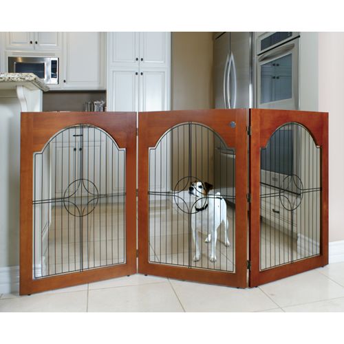 The Majestic Universal Free Standing Wire Pet Gate is the ideal way to keep your animal confined while maintaining the elegance of your home. Featuring a free-standing design with 2-way hinges, this pet gate requires no hardware mounting. The Majestic Universal Free Standing Wire Pet Gate is constructed of solid wood for durability with heavy gauge wire inserts and comes in white and a cherry finish to accent any décor.