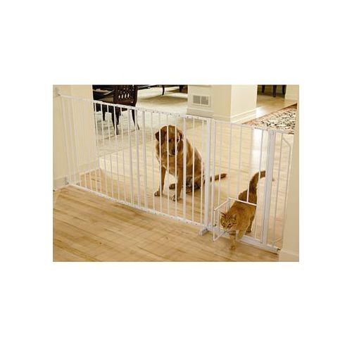 A 38-inch height makes this gate great for large pets, while the ability to expand from 37 to 60 inches makes it ideal for extra-wide openings. Its convenient walk-through design has an easy, one-touch release handle. The patented pet door lets small pets pass through while everyone else stays put. Simple wall mounts are easy to install and remove. All-steel construction is sturdy, durable, lead-free, non-toxic, and chew-proof.