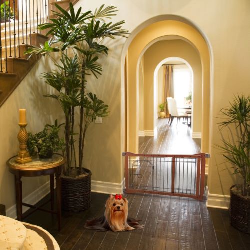 This stylish pet gate has a "tension-mount" design that allows you to attach it to a doorway/hallway opening to keep your pet safely confined in his/her own "special" area. You still have the ability to move freely about from room to room. Simply step over – it's that easy! The lockable wire door allows your pet to move about at your discretion.