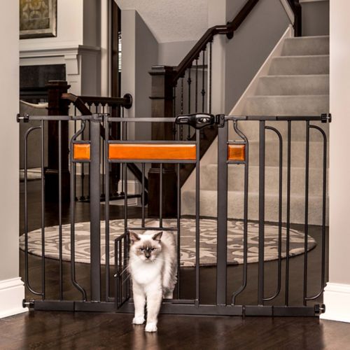 The stylish, yet functional, Carlson Design Paw Extra Wide Pet Gate is a convenient, chew-proof way to protect both your pet and home. Designed to fit with the look of your home, the gate is made of an all-steel black frame, accented by cherry wood. Featuring a walk through door, the gate is operated with ease, making frequent passing through a breeze! That same convenience is provided to your pet as the gate features a small door to let small animals pass through while keeping everyone else out. Just because a gate is needed in your home, it doesn't mean you are willing to put holes in your walls. The pressure-mount system leaves no holes and makes installation simple. This gate fits openings between 30-44" and the expandable nature gives users versatility throughout their home.