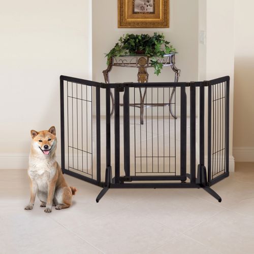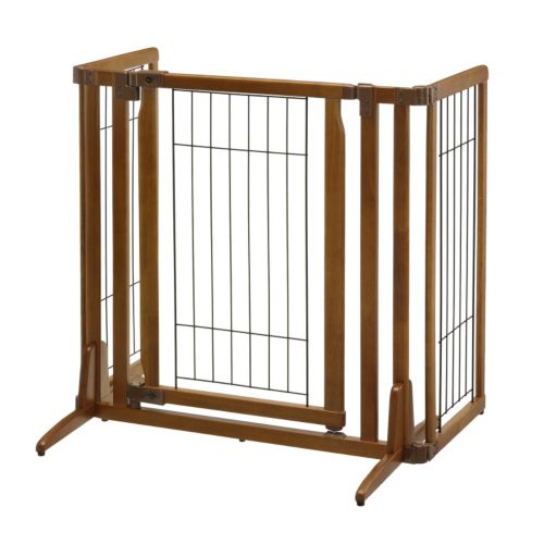 Richell's freestanding pet gate fits doorways and hallway openings from 34 to 63 inches wide. The specially designed walk-through door opens in both directions and includes an upper/lower locking system that allows free movement and extra security. The specially designed side panels adjust in increments of 10 degrees to allow you more options for use in your home. Simply adjust the gate to fit your personal needs. The eco-friendly wood complements home interiors beautifully.