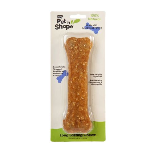 The Pet 'n Shape® Long Lasting Chewz Dog Bone is an irresistible combination of high-quality rawhide wrapped in 100% all natural sweet potato that’s coated with brown rice crispies, making for a long-lasting chew that your dog will go crazy for! Fortified with glucosamine and chondroitin to help maintain your dog’s healthy joints, Long Lasting Chews satisfy your dog’s natural urge to chew, providing a stain-free, safe, and healthy treat that keeps teeth clean and breath fresh.