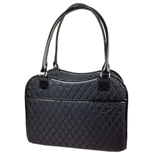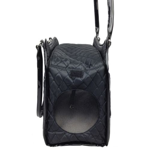 Distinctive and classic, the Pet Life Exquisite Handbag Fashion Pet Carrier features a classic black quilted pattern with patent leather shoulder straps and trim. Designed specifically for teacup-sized dogs, this stylish pet handbag features a zippered, mesh top-load opening with optional Velcro side opening, side pouch for storage, built-in leash attachment for added safety, and a removable, washable fleece pad.