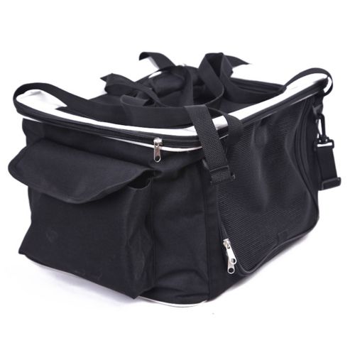 Featuring a dual design, this pet carrier easily attaches to the back of all car seats, top load mesh zippered opening, removable, adjustable shoulder strap, Velcro front pocket and side dual side pocket with mesh bottle holder.