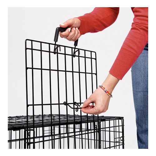 The Ovation Trainer by Midwest is an exclusive hybrid double door dog crate. It is designed specifically for crate training as your puppy grows into adulthood. A front swing-out door provides the ease and convenience of letting your pup in and out. The up and away side door conveniently slides and stows overhead. The safety catch on the side door allows the door to rest safely above a fully open position while a release of the safety catch allows the door to close easily.